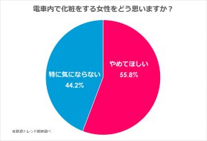 【調査アーカイブ】電車内での化粧、55.8%が「やめてほしい」と回答。男性は女性より寛容傾向