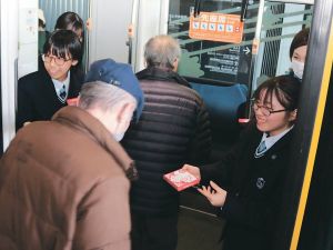 【バレンタイン】富山地鉄「フラワーポートラム」で高校生がチョコ配布